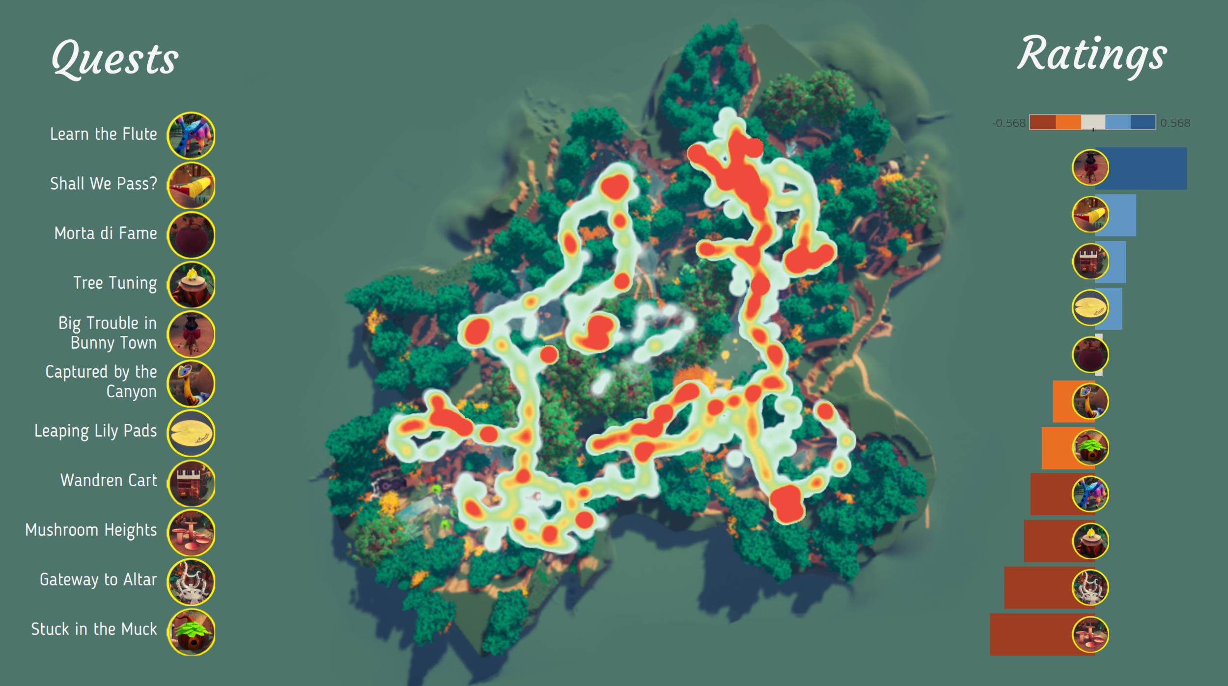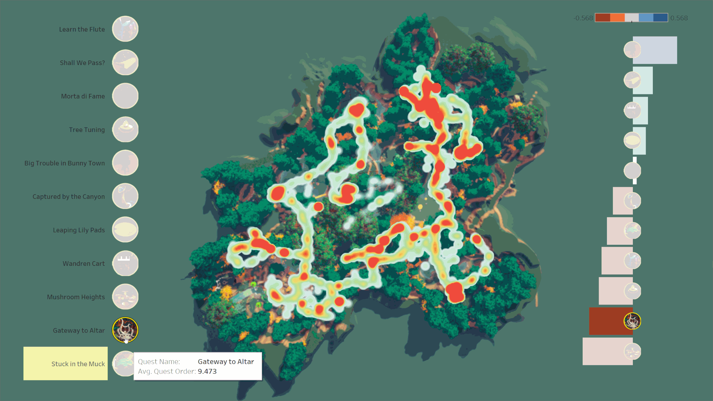 As we moved into our primary testing sprints, I visualized data gathered by the Telemetry systems for user research reporting. Tableau made it simple for me to create engaging visual aids for the team. The data was then presented to level and quest designers and used to drive creative decisions. The automated nature of the systems became crucial due to the loss of our ability to conduct in-person playtests during the Covid-19 quarantine.